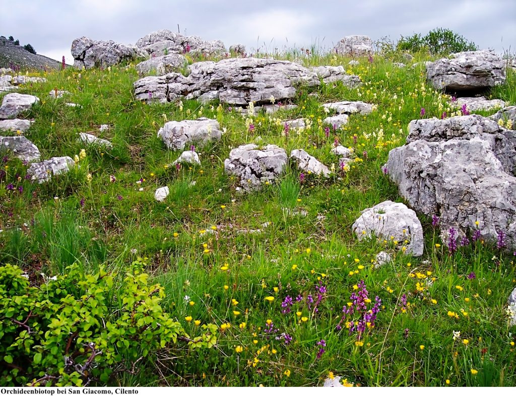 Ein weiterer Schwerpunkt lag auf den Serapias-Arten, charakteristisch für Süditalien, mit ihren zungenförmigen Blüten. Besonders im Cilento und in Feuchtwiesen des Lambro-Tals fanden sich reiche Bestände von Serapias lingua, cordigera und deren seltenen Hybriden. Auch botanische Besonderheiten wie Serapias politisii, sonst nur aus Griechenland bekannt, wurden erwähnt.