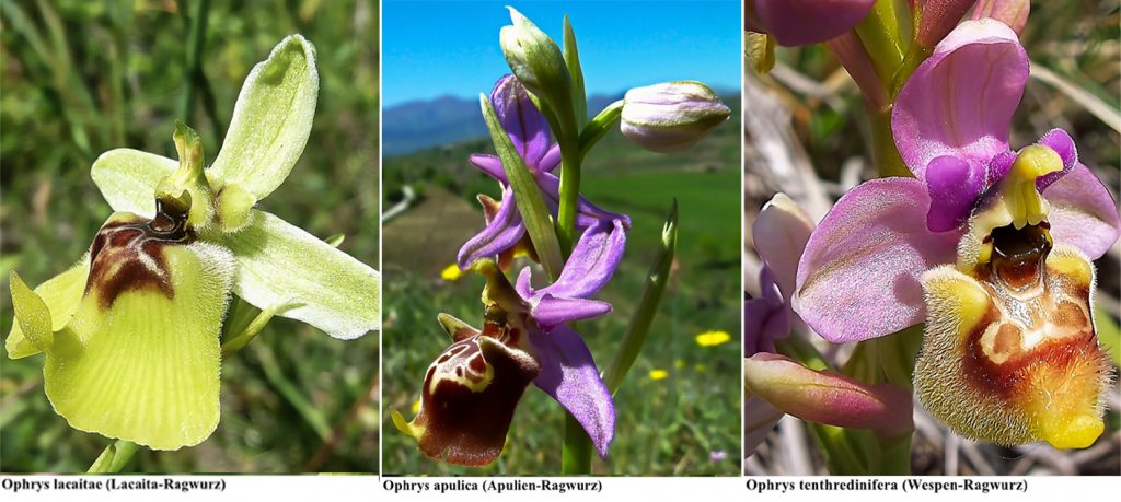 Im zweiten Teil widmete sich der Vortrag ausführlich der größten und artenreichsten Gattung, den Ragwurzen (Ophrys). Dr. Kötter erläuterte morphologische Merkmale zur Bestimmung – Aufbau von Lippe, Sepalen, Petalen, Anhängsel, Konnektivfortsatz – und führte dann eine beeindruckende Reihe von Arten auf: von der Fliegen- und Bienen-Ragwurz über die Ophrys fusca-Formen (braune Ragwurz) bis hin zu endemischen Arten wie Ophrys lucana, cilentana, pollinensis, apulica oder lacaitae. Dabei beschrieb er, wie naheverwandte Arten ineinander übergehen und wie häufig Hybride und Übergangsformen auftreten – ein Hinweis auf die dynamische Evolution in diesen isolierten Lebensräumen.